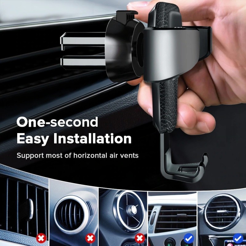 Едно от главните предимства на тази поставка е, че се закрепва лесно за въздуховода на автомобила. Това означава, че телефонът ви ще бъде на една ръка разстояние през цялото време, без значение от неравностите на пътя. Раменете на стойката се стягат гравитационно, когато поставите телефона, осигурявайки максимална стабилност и защита.