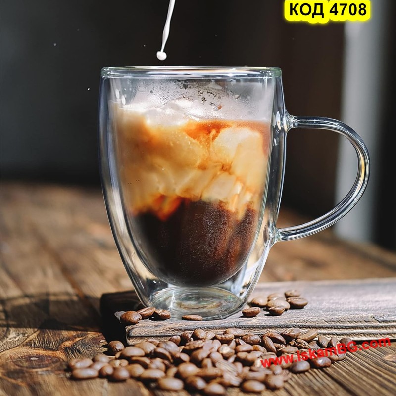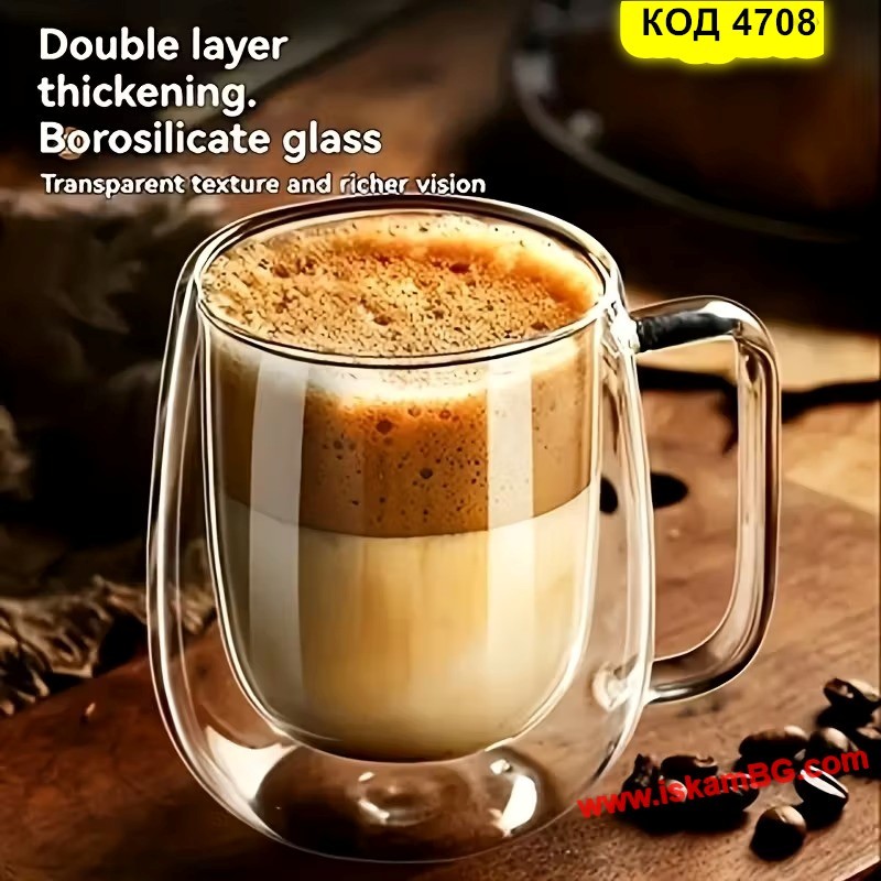 Елегантна двустенна стъклена чаша с дръжка, създадена за максимален комфорт при пиене на топли напитки.