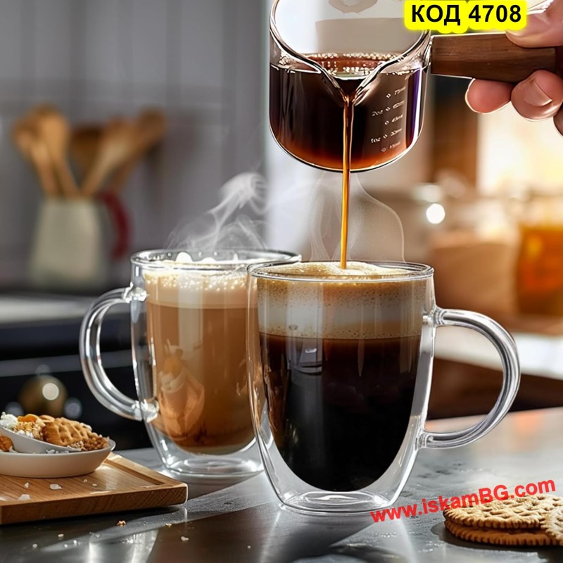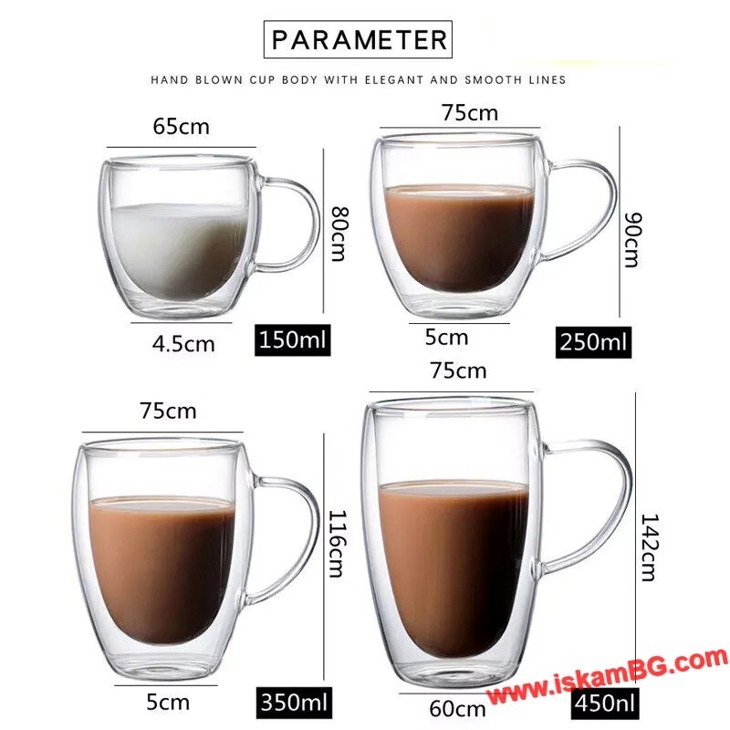 Двойните стени осигуряват отлична изолация – напитката остава топла по-дълго, а външната част не се нагрява. Дръжката осигурява удобен захват, а прозрачният дизайн подчертава красотата на напитката.