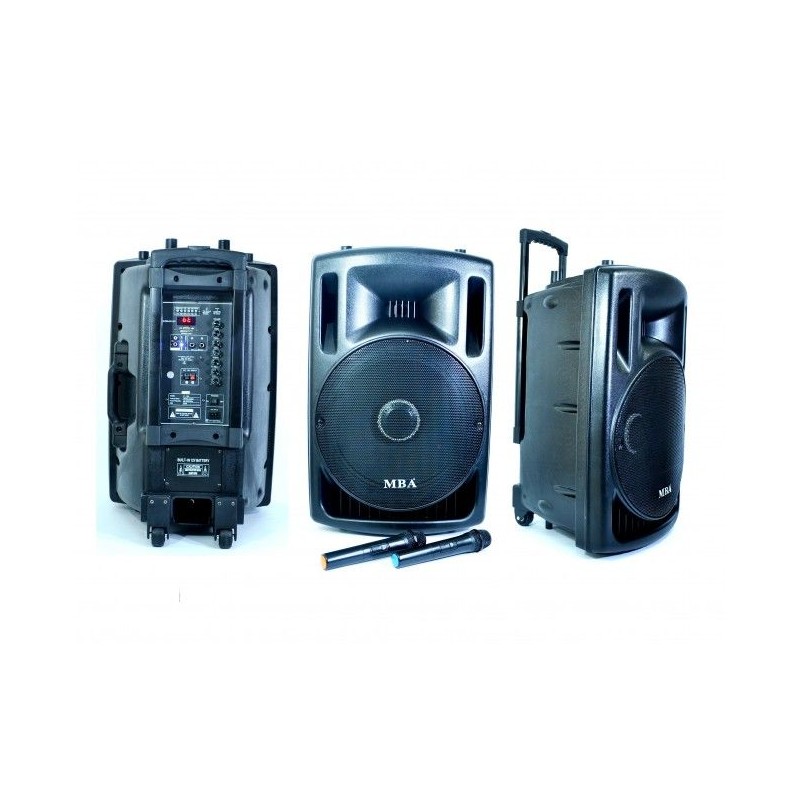 Супер мощна акумулаторна караоке аудио система MBA F15А с диско светлини и 2 безжични караоке микрофони за озвучаване на всякакви събития, сватби, събори. MBA F15A e мощна акумулаторна аудио система с пълна функционалност на професионален DJ пулт, експлозивна мощност и HiFi качество на звука. Уредбата възпроизвежда MP3 директно от USB Flash или карта памет SD. Малкият дигитален дисплей показва честота на станция или номер на възпроизвежданата песен / файл.