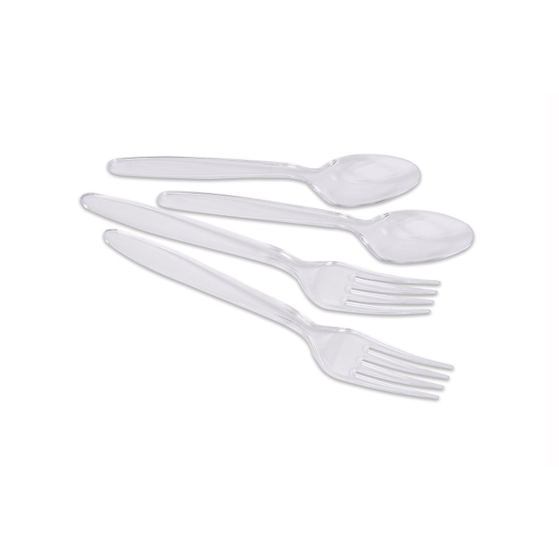 50 броя прибори за еднократна употреба (25 броя вилици и 25 броя лъжици), изработени от твърда прозрачна пластмаса.