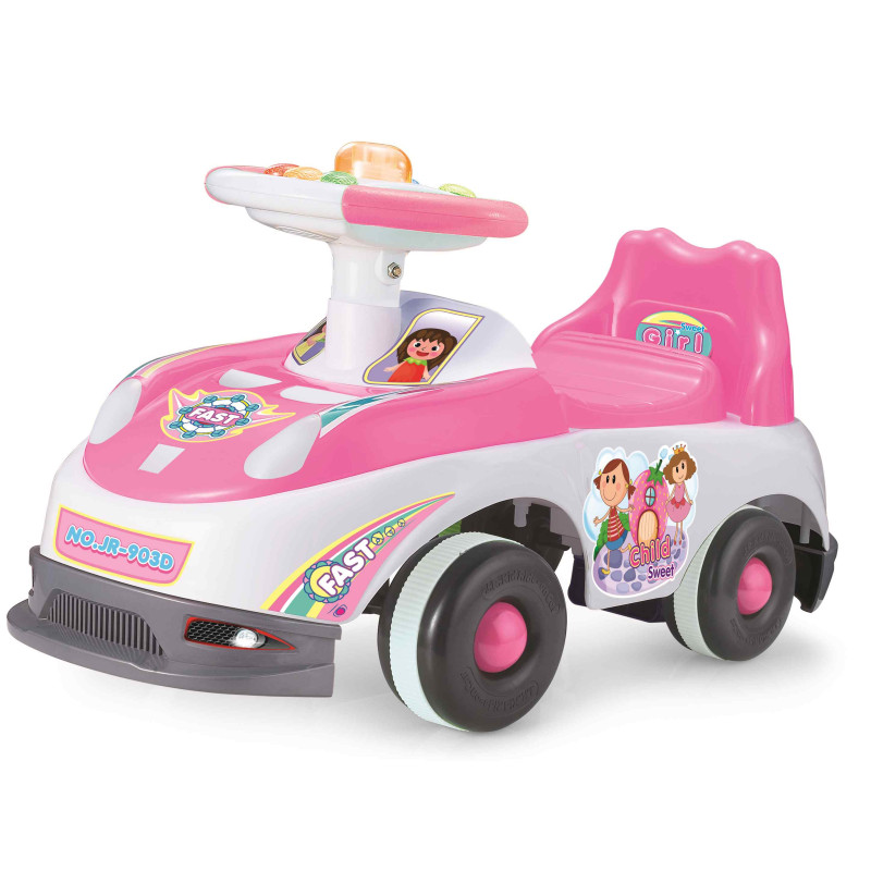 Детска състезателна кола за бутане и яздене в бяло и розово с музика и светлини.