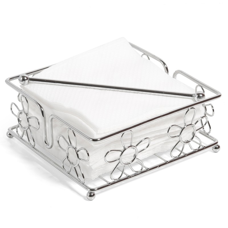 Квадратен метален салфетник, изработен от неръждаема стомана с хромирано покритие в сребрист цвят с декоративни цветя.